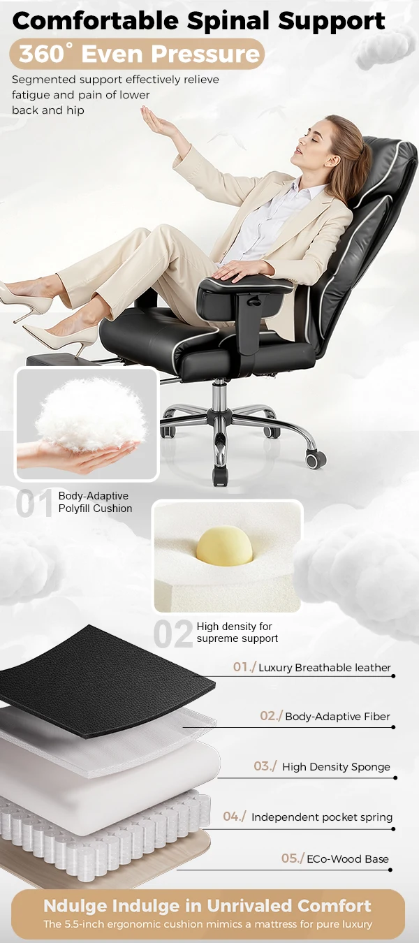 【Stable and Durable Construction】The frame of this oversized desk chair is made of sturdy metal, built to with stand the test of time, the heavy duty office chair features a 3-level gas lift and heavy duty metal base. This luxury office desk chair offers unwavering stability and eliminates the worry of gradual sinking. The backrest reclines from 90° to 150°, meeting the needs of work, reading, entertainment, and relaxation<br>