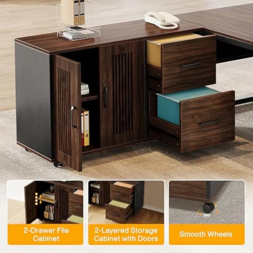 • Mobile File Cabinet: The mobile filing cabinet of the L-shaped desk features adjustable storage, louvered doors, and 2 drawers, providing easy file organization. Four smooth rolling wheels allow for easy movement, helping you create a functional workspace