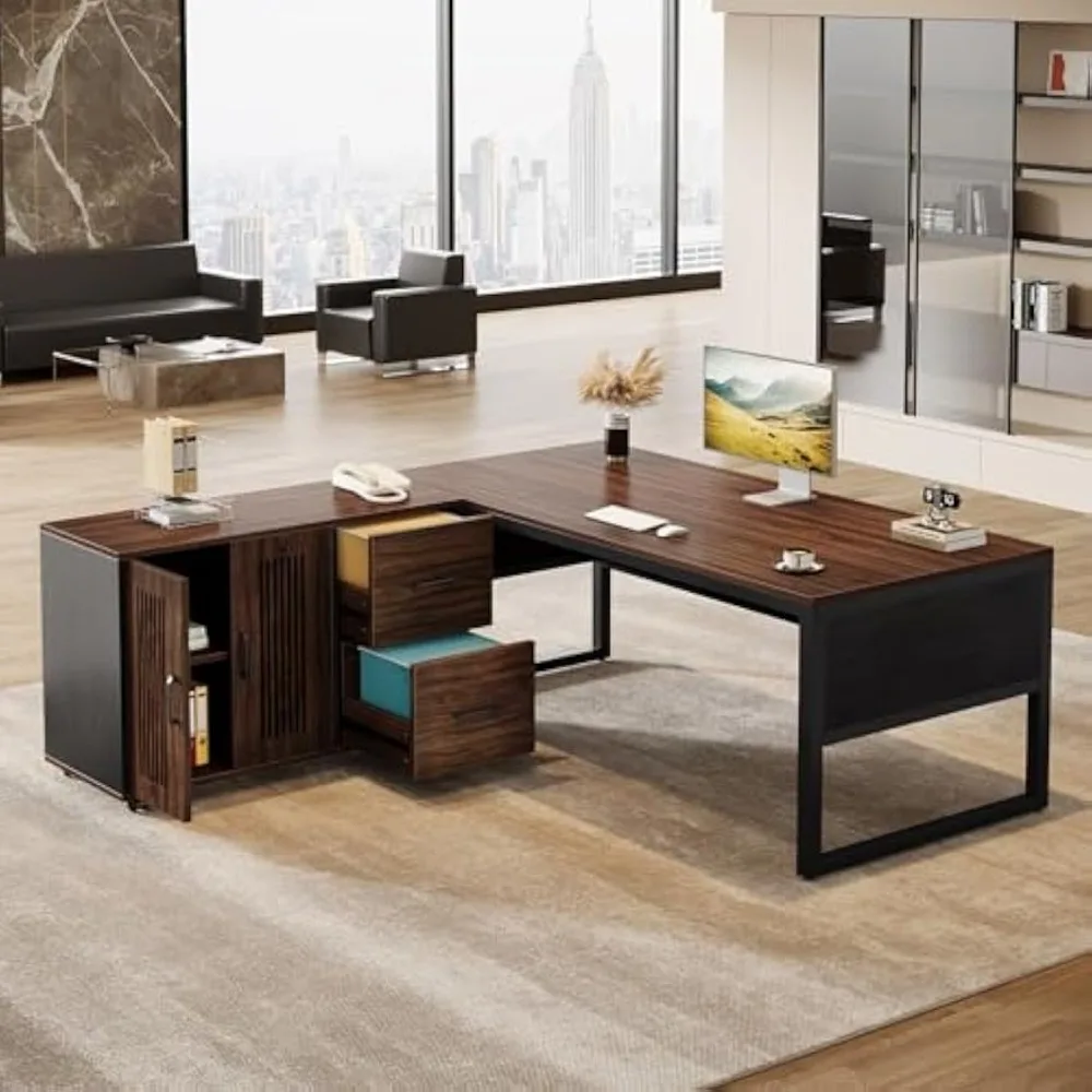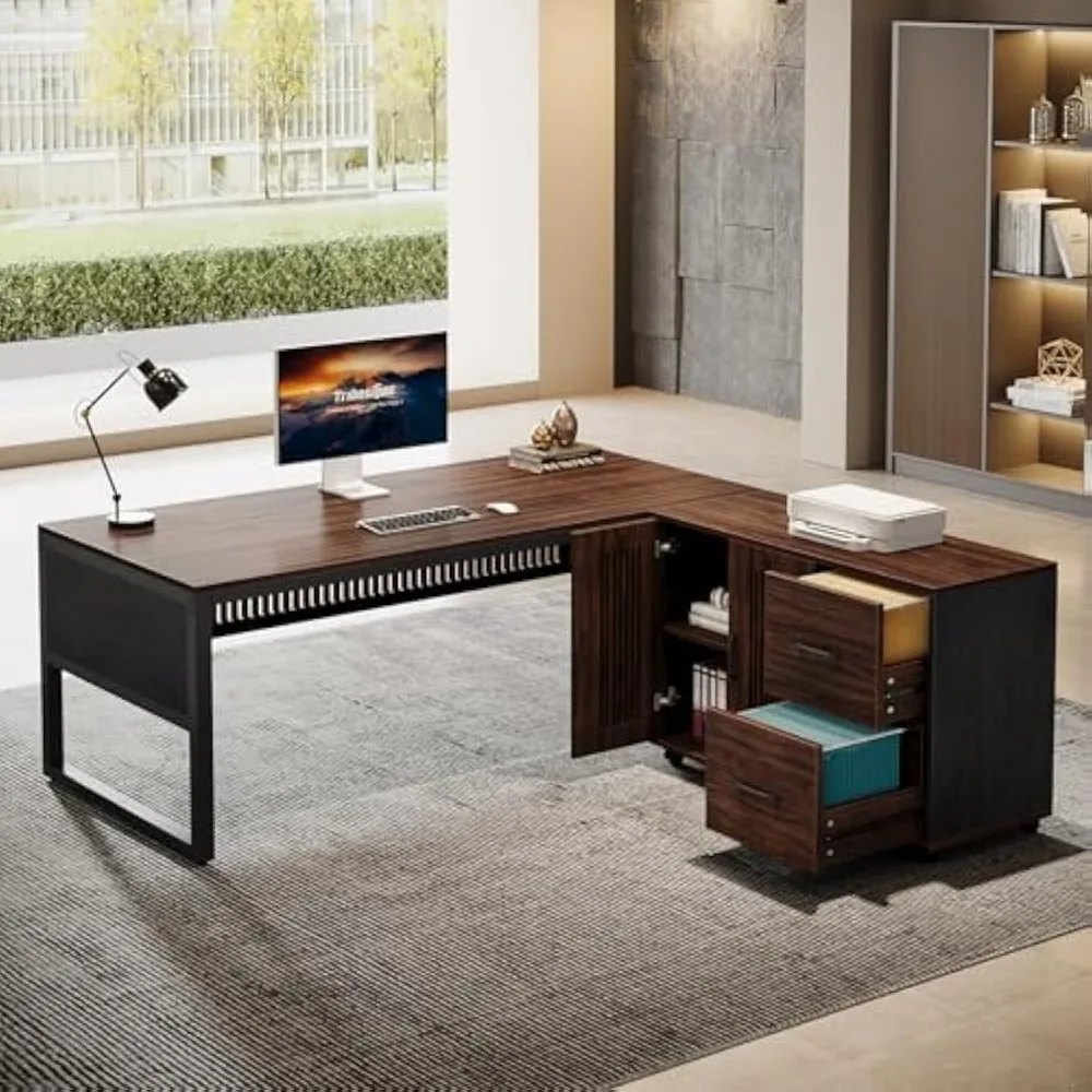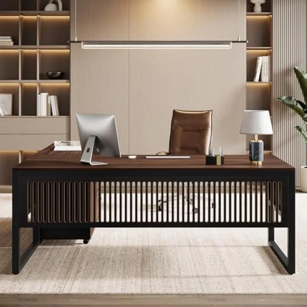 • Modern L-Shaped Office Desk: This executive desk features a modern L-shaped design and comes with a mobile storage cabinet, creating a multifunctional workstation. The walnut veneer and black frame provide an exquisite work environment for your office