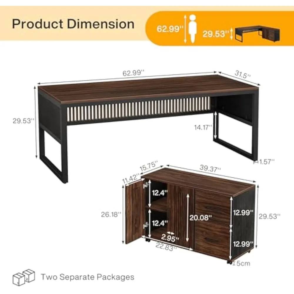 • Spacious Workspace: The office desk offers a 63-inch desktop and a 39.4-inch filing cabinet, making it easy to accommodate various office supplies. The filing cabinet can be freely placed on both sides of the table, providing you with flexible space